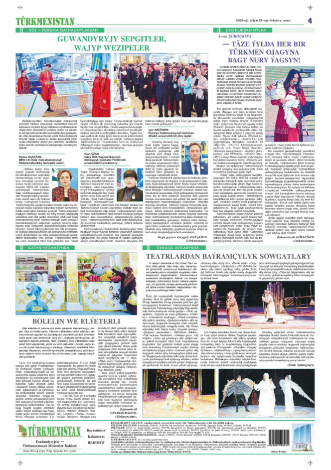2023年为土库曼斯坦的“与阿尔卡达格·谢尔达尔(Arkadag Serdel)同行的青年快乐年”。本年度,土库曼斯坦顺利开展了全方位的国际合作,涉及与国计民生相关,尤其是事关青年人发展的各个领域。在科学、教育、文化、社会全域并举的发展框架下,许多重要活动更积极地吸纳国内外年轻人的活力,让青年人踊跃参与到国家发展和合作之中。