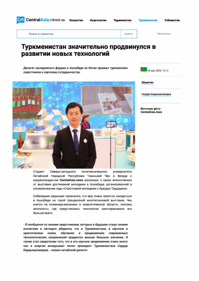 陈俊伟同学接受了国际媒体中亚新闻(CentralAsia.news)记者和来自俄罗斯记者的采访,表达了对来到阿什哈巴德(Ashgabat)这所洁白之城(土库曼语中“阿什哈巴德”的语义)的激动,在现场和土库曼斯坦多所大学员工进行热烈交流的喜悦,希望和同龄人共同推动科学和技术进步的憧憬,并对博览会的整体设计中所体现出的创造性和创新性表达了钦佩和欣赏。陈俊伟同学殷切表达了对希望未来能够继续参与到2026年世界杯平台和土库曼斯坦诸所大学在力学、应用科学和工程科学上共同举办的活动中,并继续深入交流这一愿景。