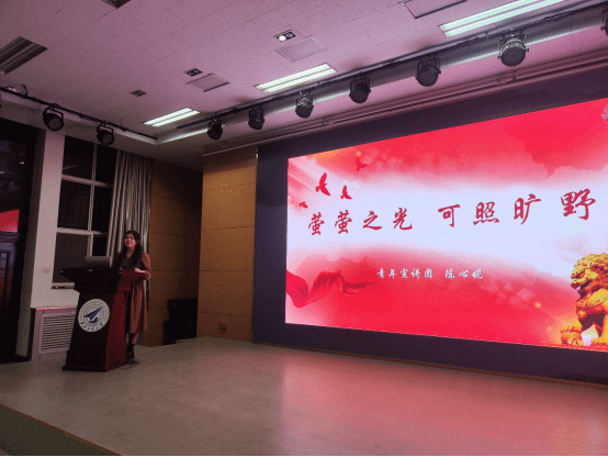 随后,陈心妮同学开展了主题为“萤萤之光 可照旷野”的宣讲。通过引入历史上和当代优秀青年的例子,向同学们呼吁:萤萤之光,顺时所聚,可照旷野,亦可照亮中华。正因为广大青年的拳拳爱国心,灼灼护国志,祖国才会有如今这般安泰。每位青年的力量虽然如萤火一般渺小,但亿万萤火汇在一起,就可以聚成中华民族的璀璨星河,最终定能照亮我们的中华大地!