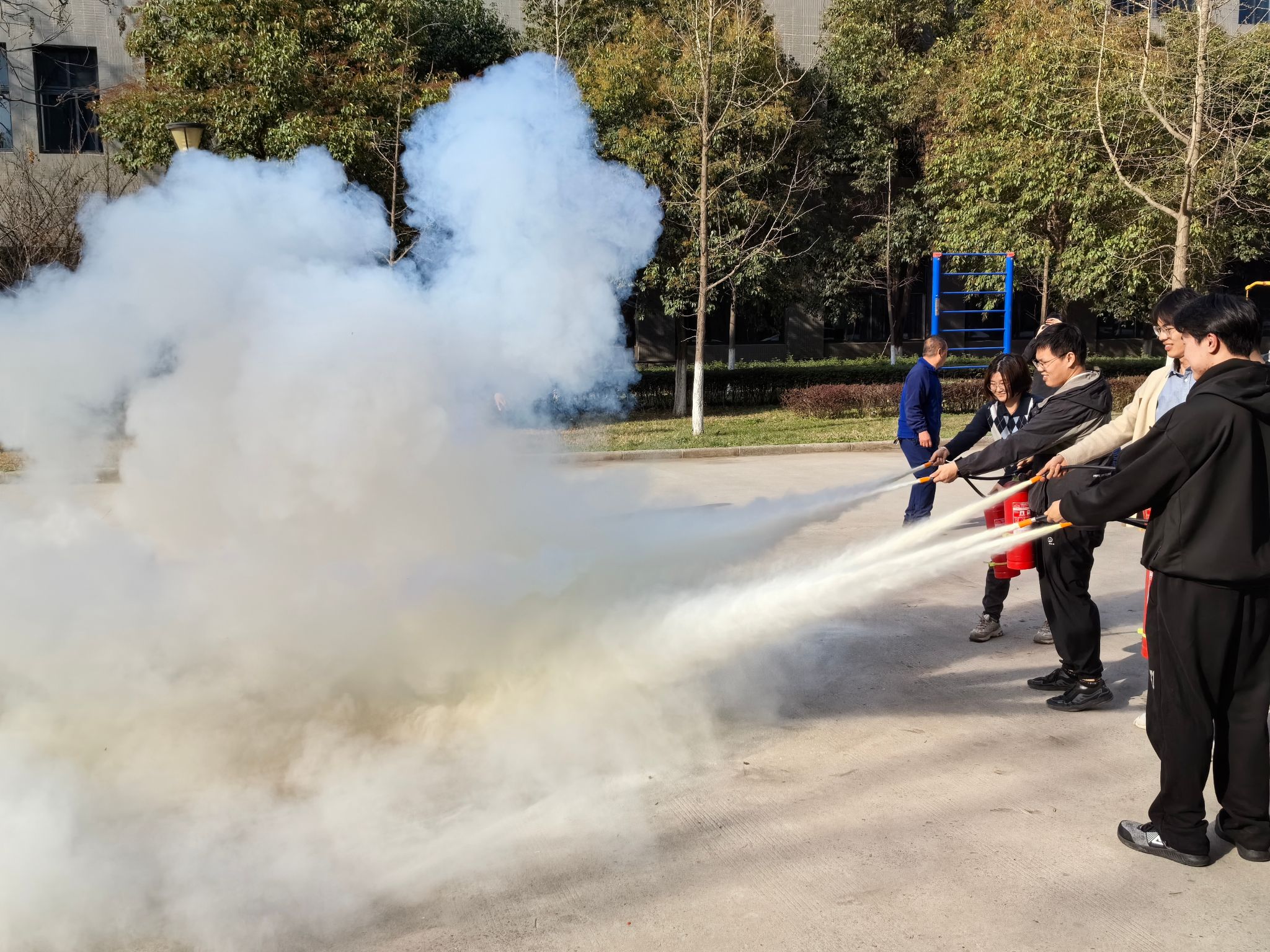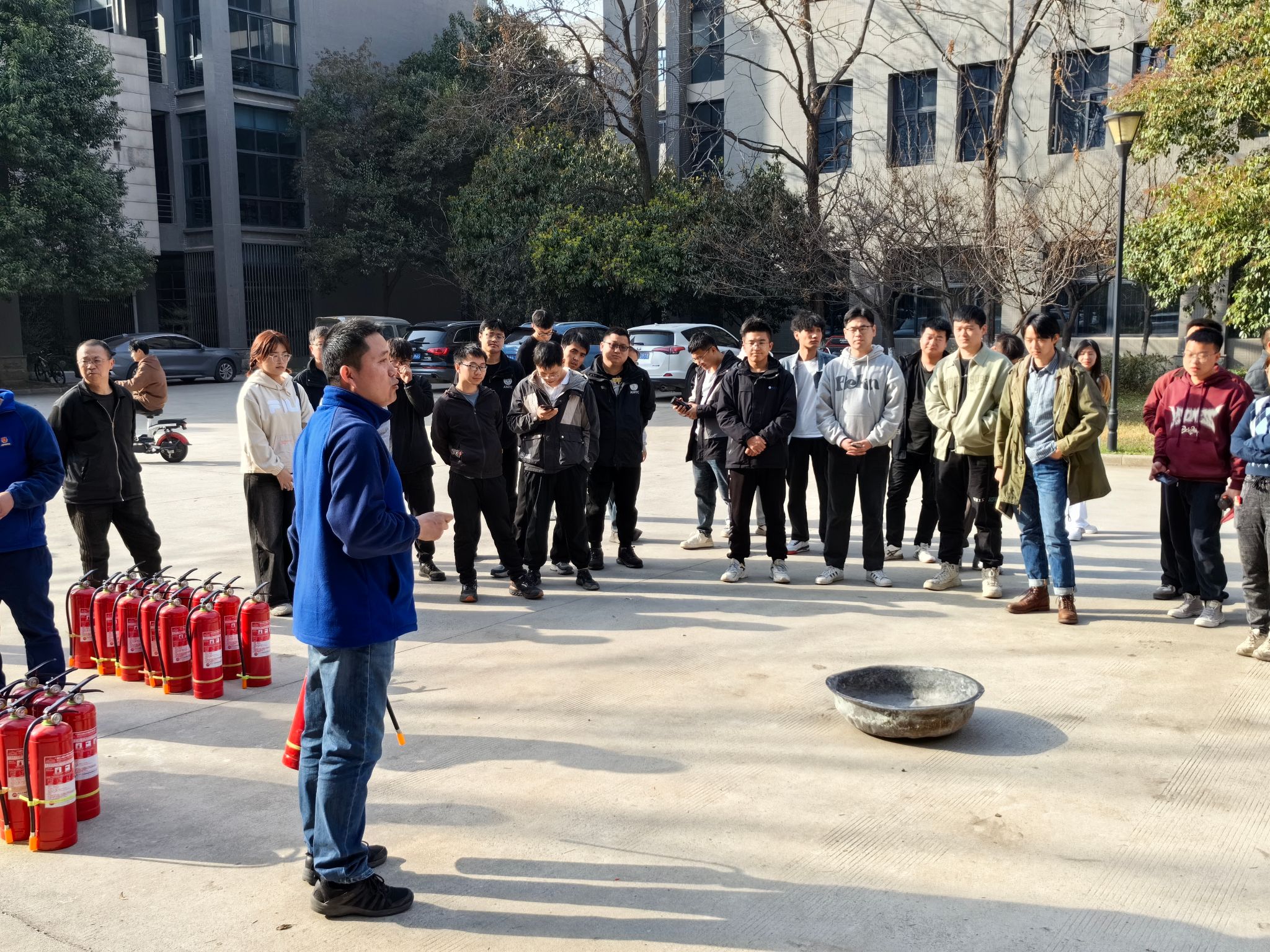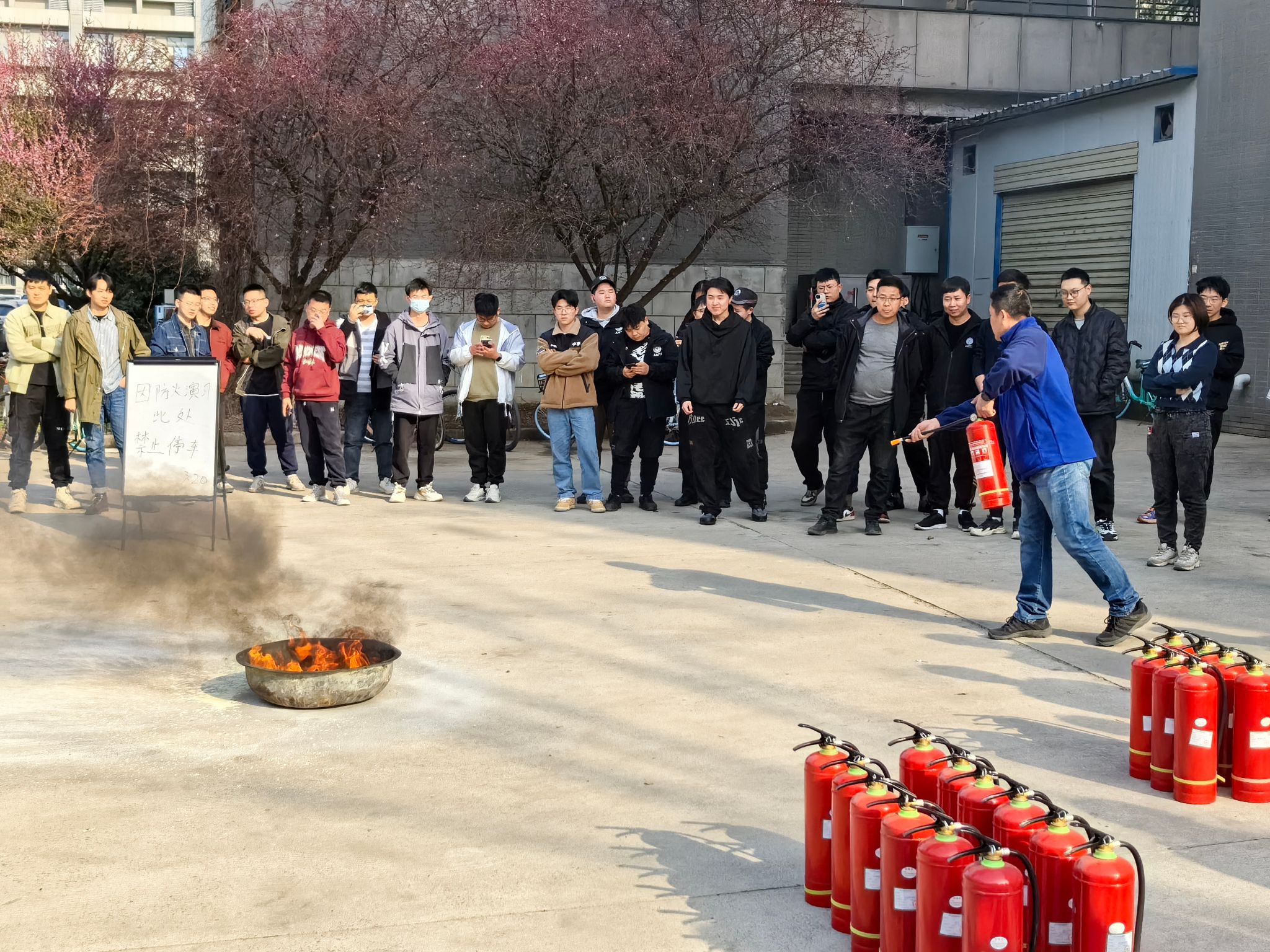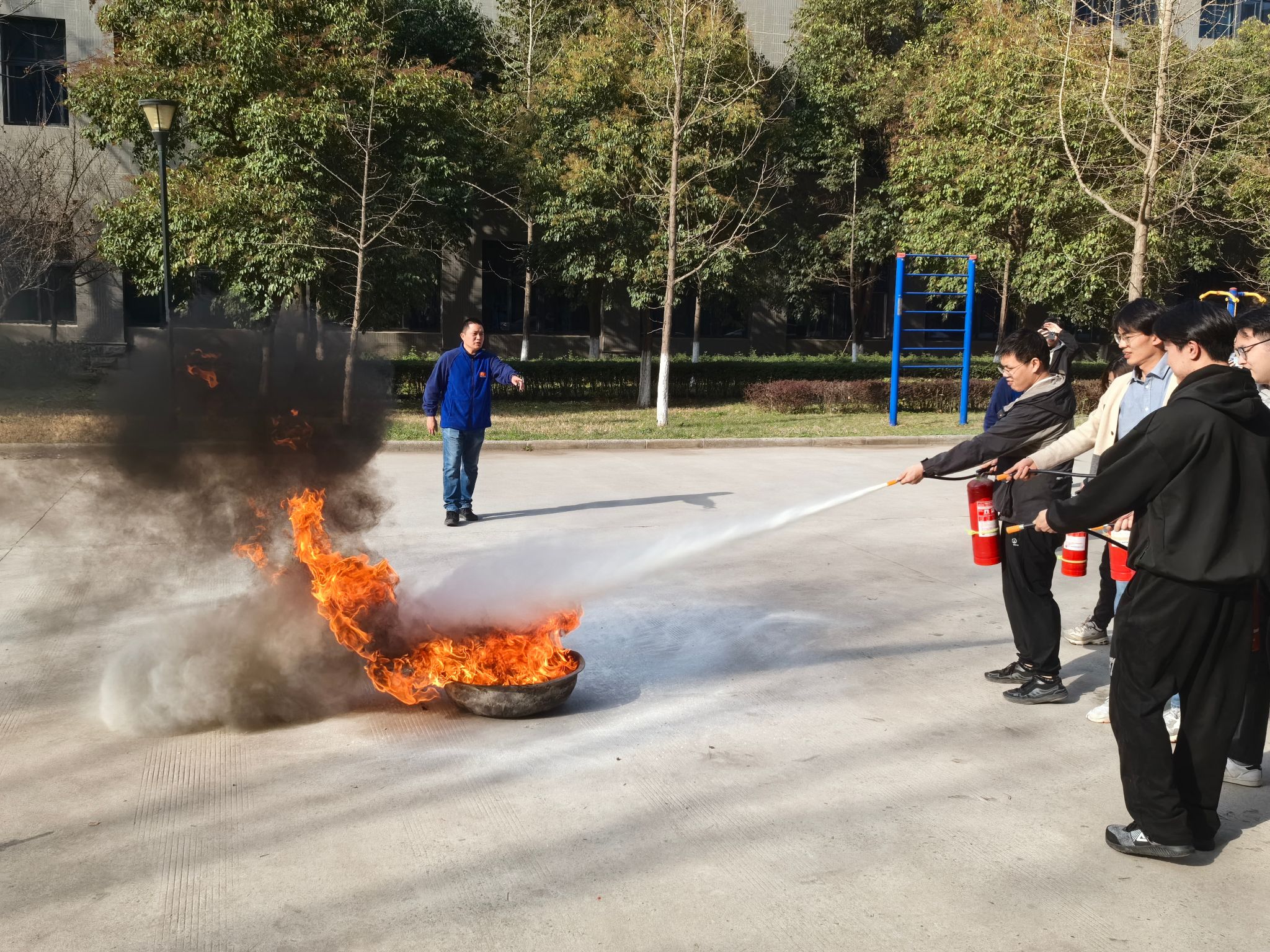 讲座结束后,消防科在公司楼后空地为公司师生组织了一场灭火器实操演练。培训人员给大家讲解了灭火器的操作方式以及使用要领,并就如何判断风向从而做到安全、有效地灭火进行了亲自指导。讲解之后,公司师生轮番上阵,使用干粉灭火器对道具火盆进行实操演练,演练效果十分理想,大家对于火灾初期的控制与扑救有了更多的了解,灭火器的使用也更加得心应手。