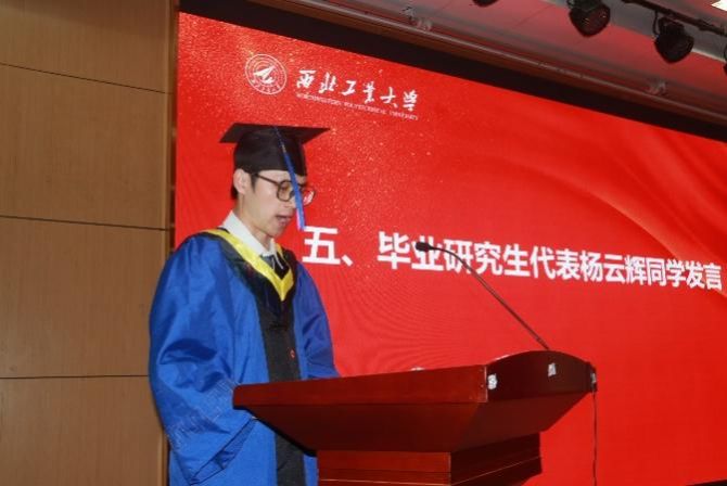 随后,毕业研究生代表杨云辉同学发言,他首先向公司和各位老师表达了自己的感激之情,然后向大家分享了自己从本科到研究生八年工大求学路上的所见所闻所感,并表示会用自己所学的专业知识和技能回报公司和公司,服务社会,奉献社会。