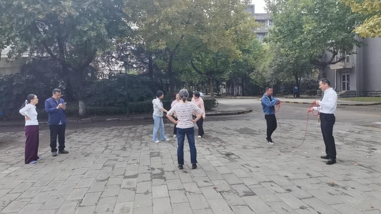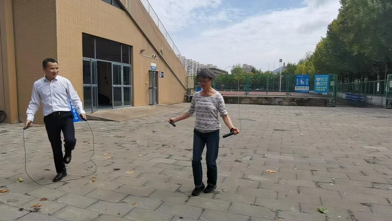 本次运动会的主题为“迎国庆”,老师们欢聚在一起用“投掷沙包”、“围个大圆圈踢毽子”、“集体跳大绳”、“单人跳绳”、“连续托乒乓球”等欢快运动的方式喜迎祖国75岁生日。