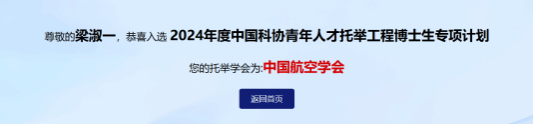 近日,中国科协办公厅正式公布了2024年度中国科协青年人才托举工程博士生专项计划(首批)的评选结果。力学与土木建筑公司2022级力学专业博士生梁淑一经过层层评选,脱颖而出,成功入选该计划,托举学会为中国航空学会。