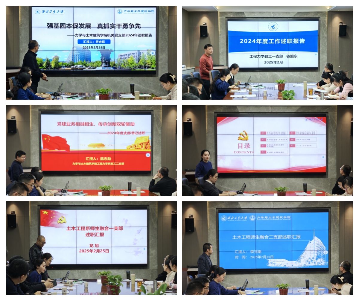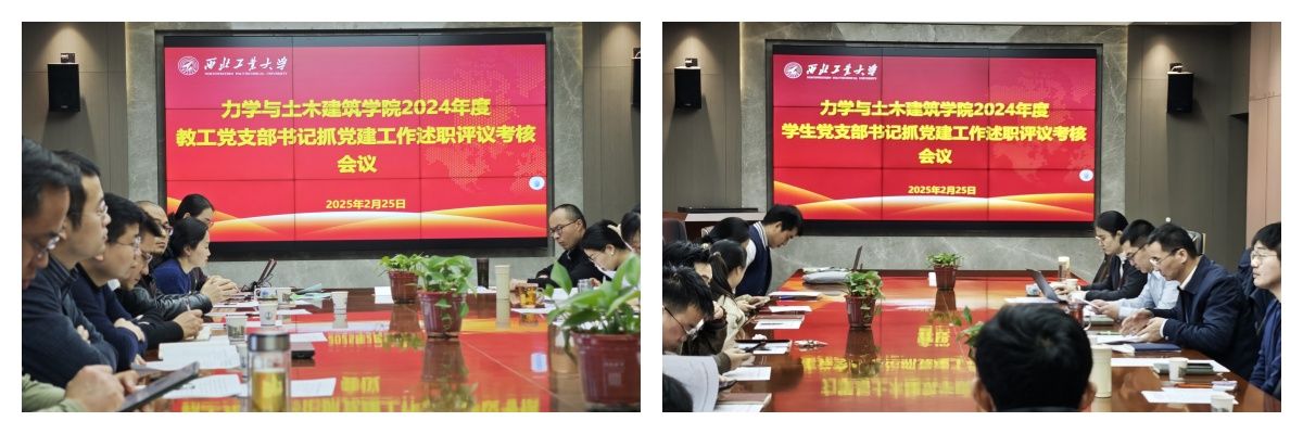 2月25日上午和下午,力学与土木建筑公司在206会议室分别召开了2024年度教职工、员工党支部书记抓党建工作述职评议考核大会暨2月党支部书记工作例会,公司领导班子成员、师生党支部书记、系主任、师生代表等参加会议。会议由公司党委书记巨维博和党委副书记路宽分别主持。