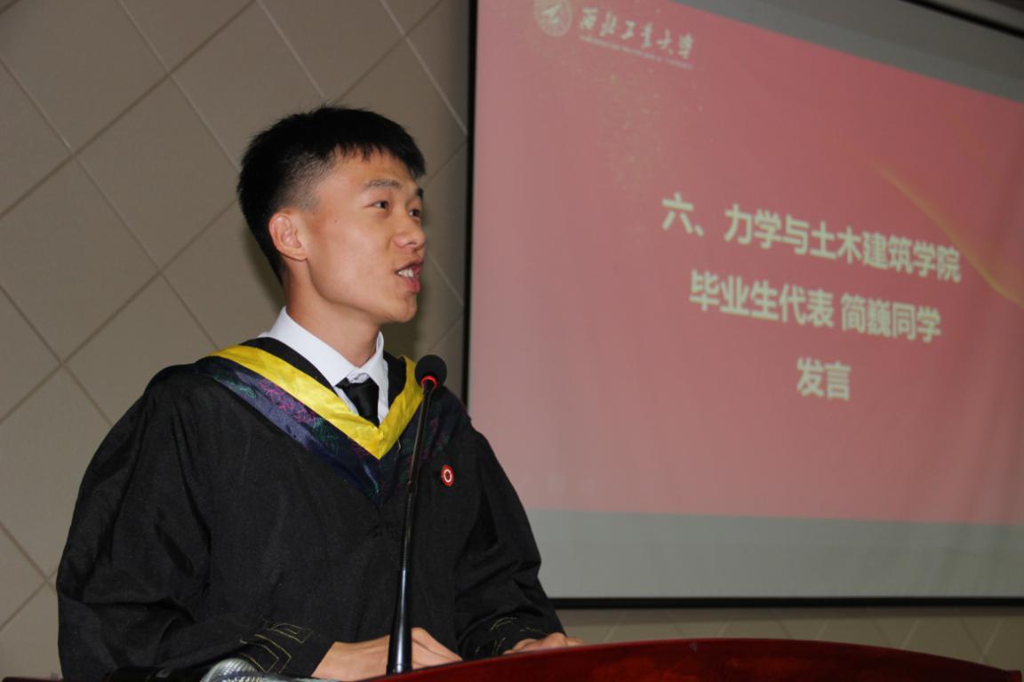 毕业生代表简巍向深情回顾了在公司四年的求学之路,并代表公司全体毕业生感谢公司、公司和各位老师的培养。简巍号召2021届毕业生同学们树立正确的世界观、人生观、价值观,不要在该奋斗的年纪选择安逸,到祖国需要的地方奋斗启航。