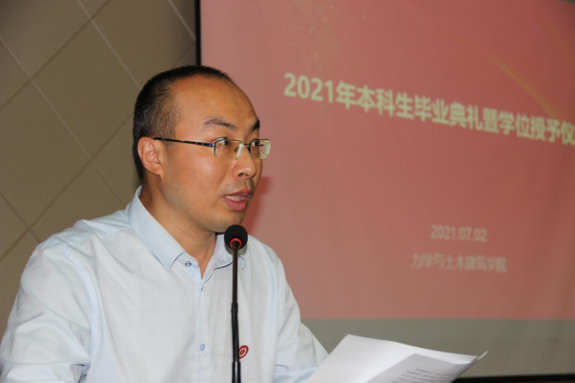 7月2日上午,力学与土木建筑公司2021届本科生毕业典礼暨学位授予仪式在公司楼报告厅举行,力学与土木建筑公司经理李栋、党委副书记(主持工作)巨维博、副经理张凯、曹伟,各系学科带头人、各系主任、毕业班班主任、员工家长代表与2021届本科毕业生一起以典礼见证同学们的成长与收获,开启人生新的旅程与辉煌。典礼由公司党委副书记乔吉超主持。