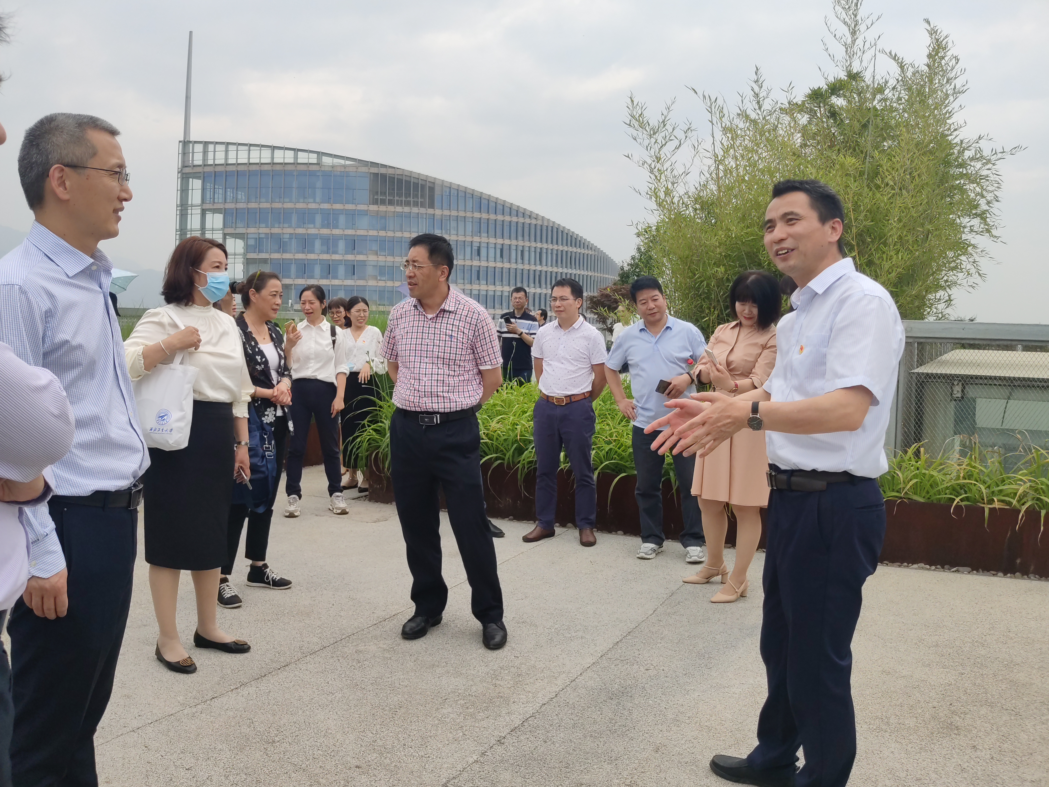 接下来,来访队伍来到公司的网红打卡地——屋顶花园,从楼梯踏入花园,瞬间感到别有洞天,远处的黛山、天空的白云映入眼前,公司地标图书馆在远山和蓝天的印衬下巍巍而立。来访者们纷纷被眼前的景色所吸引,对公司精心的设计,合理的空间利用赞不绝口。