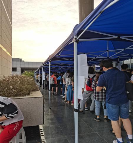 公司志愿者在现场医生分配下,服从安排,分成了4人场外咨询工作组、4人入场信息录入组、4人室内接种台工作组、6人出场校验工作组和2人调配工作组。场外咨询工作组主要为接种人群指导预约流程;指引接种路线;解答其它相关困惑。