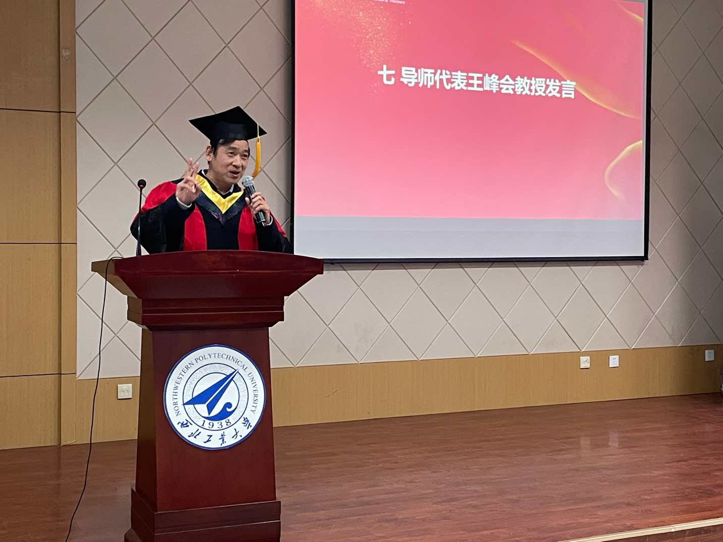 研究生导师代表王峰会教授向毕业生提出谆谆教导,他希望毕业生德智并重,顺势而为,自信向上,踏实做好每一件事。