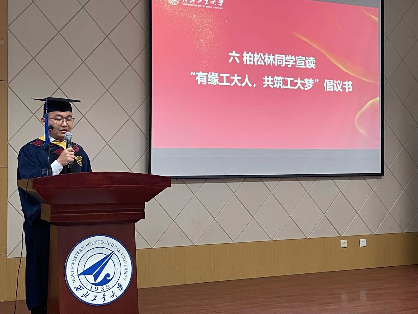 毕业生代表柏松林宣读了“有缘工大人,共筑工大梦”的倡议书,呼吁大家树立正确的世界观、人生观、价值观,勇于奉献、敢于担当,常怀感恩之心,让感恩的美德在一代代工大人中继续传承,无论身处何方都与母校同在。