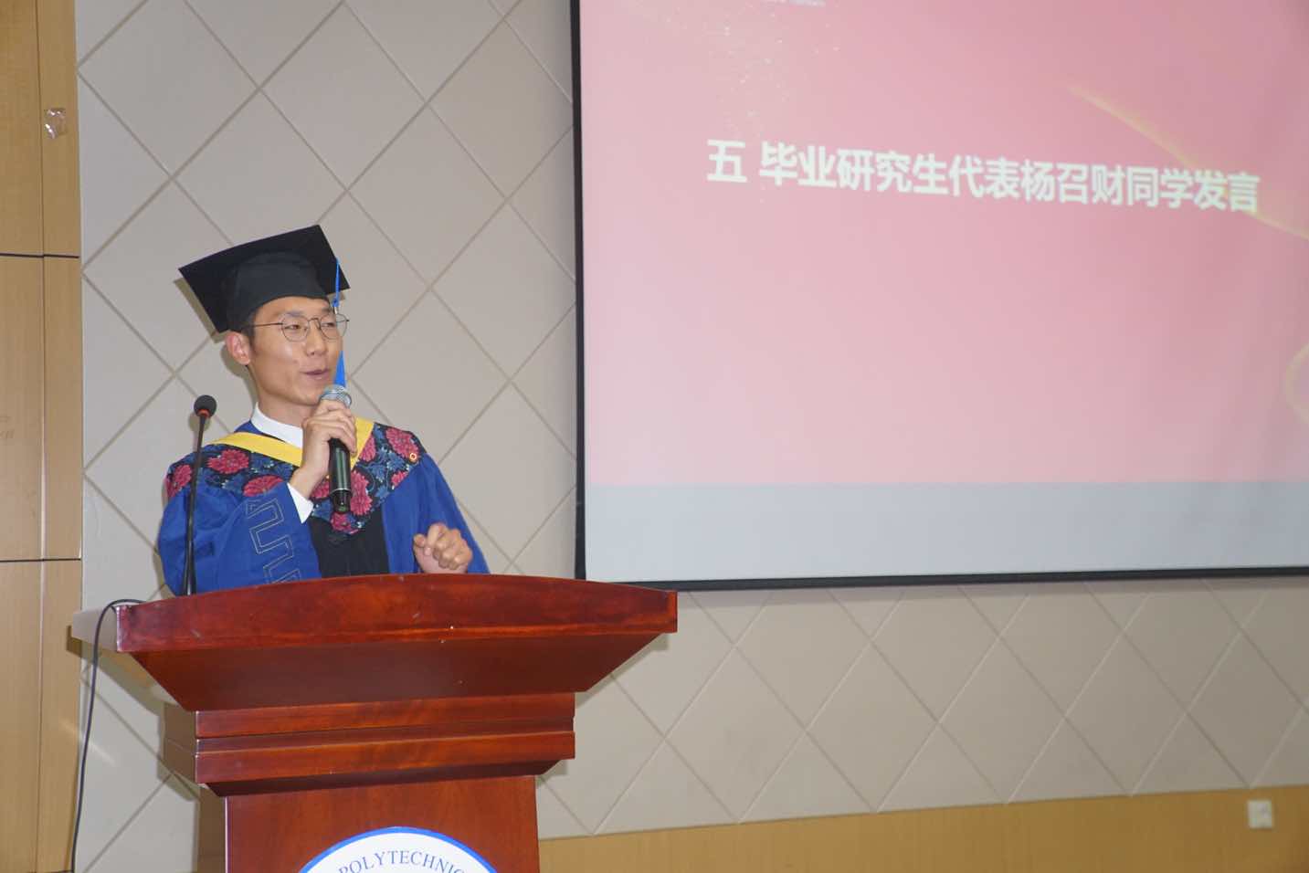 毕业生代表杨召财向公司各位领导、各位老师表达了由衷的感谢,他回忆了自己的“工大记忆”,号召广大毕业生们“披战袍,穿金甲,执利器”,发挥个人价值,希望大家今后无论身处什么样的岗位,在面向挑战的时候,在面临挫折的时候,都能执着梦想,勇往直前,无论走到哪里,都永远铭记,我们是“工大人”,用最豪迈、最稳重的步伐,朝着未来前进。