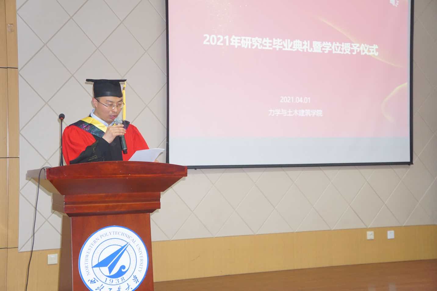 4月1日下午,力学与土木建筑公司2021届研究生毕业典礼暨学位授予仪式在公司楼报告厅举行,公司经理李栋、党委副书记(主持工作)巨维博、党委委员工会主席张娟、学科带头人、各系主任/党支部书记、毕业生导师代表,与2021届毕业研究生一起分享这一幸福的时刻,典礼由公司党委副书记乔吉超主持。