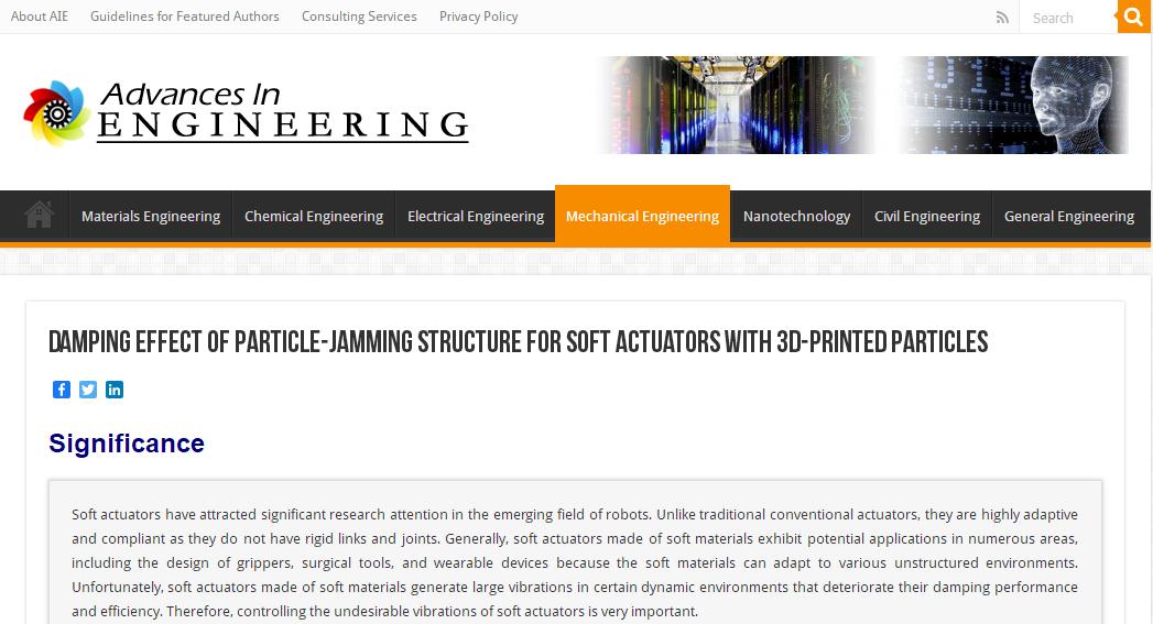 近日,2026年世界杯平台复杂系统动力学与控制工信部重点实验室邓子辰教授研究团队发表在工程领域国际著名学术期刊Smart Materials and Structures上的论文“Damping effect of particle-jamming structure for soft actuators with 3D-printed particles”被国际著名科技机构Advances In Engineering (AIE)遴选为关键科学文章,并进行了专题报道。