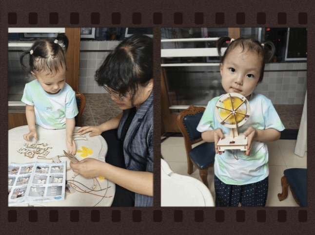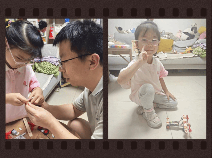 亲子共同制作过程中,孩子们屏住呼吸,小心翼翼地组装零件,专注地拧着螺丝。家长们化身耐心十足的“技术后援”:爸爸们蹲在孩子身边,帮忙稳住摇晃的装置,轻声讲解原理;妈妈们则在一旁细心指导孩子使用工具,用手机记录下每一个专注的侧脸和成功的瞬间。当遇到“技术难题”——比如电路没接通、螺丝拧不紧时,全家人一起开动脑筋,“爸爸试试这样?”“宝贝,你看说明书这里说……”共同解决问题的过程,充满了温馨的协作感。当小小的“电动风扇”呼呼转起来,电灯泡通电以后亮起来,四驱车在地上跑起来,孩子们骄傲地展示着,每一次小小的成功,都伴随着最纯粹的惊叹和开怀的笑声,家庭里洋溢着浓浓的成就感和节日的喜悦。