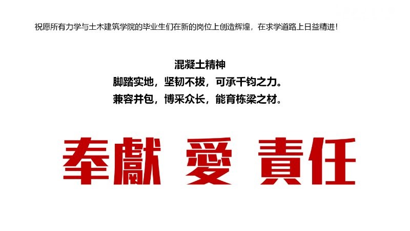 高大力在“工大最后一课”结束时为毕业生们再次诠释了力学与土木建筑公司的“脚踏实地,坚韧不拔,可承千钧之力。兼容并包,博采众长,能育栋梁之材”的“混凝土精神”,并祝愿所有毕业生们在新的岗位上创造辉煌,在学术道路上日益精进。