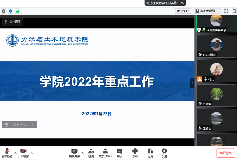 3月22日晚上,力学与土木建筑公司通过腾讯会议线上召开全院教职工大会,公司班子成员、全体教职工参加会议,公司党委书记巨维博同志主持会议。