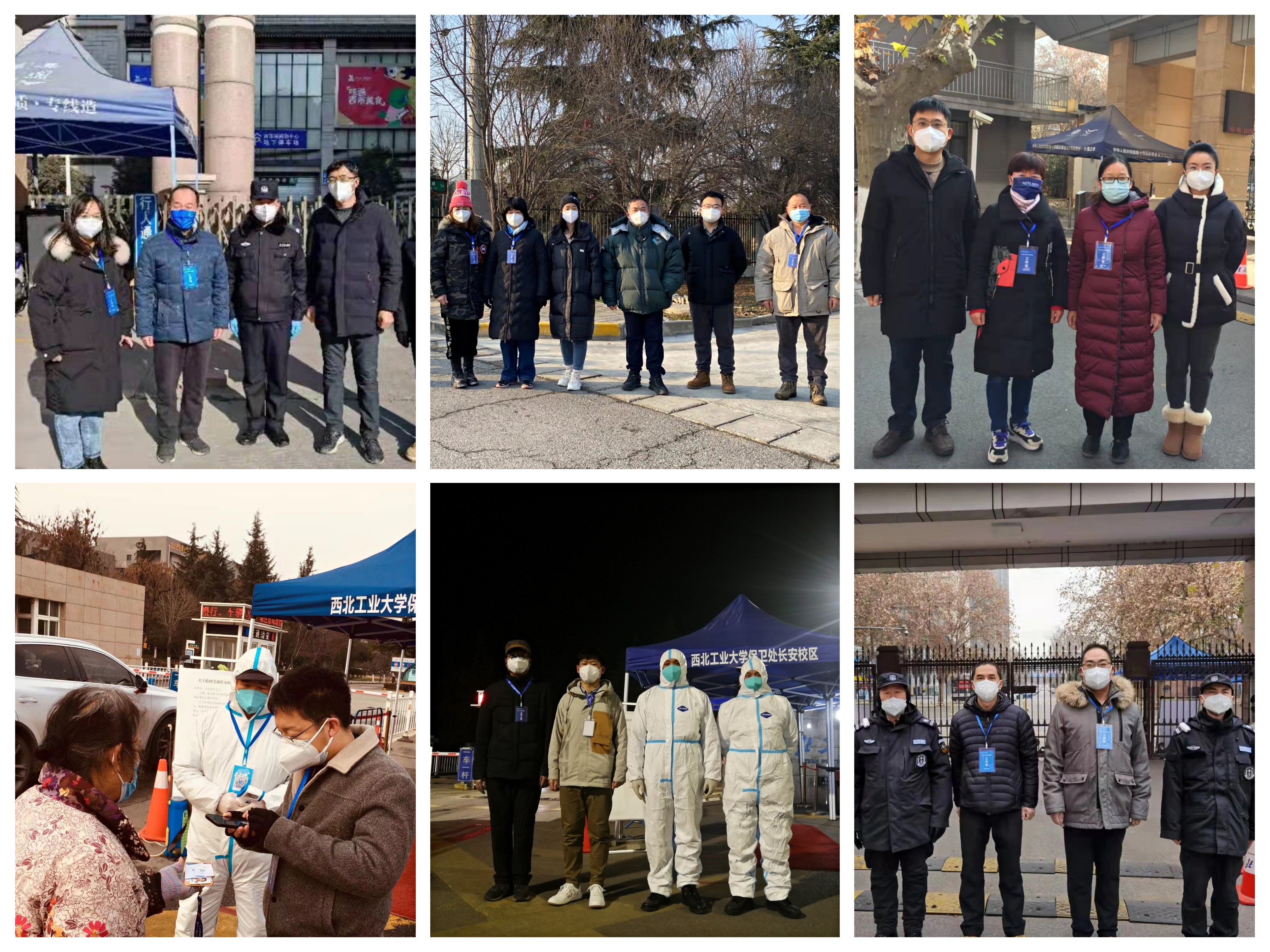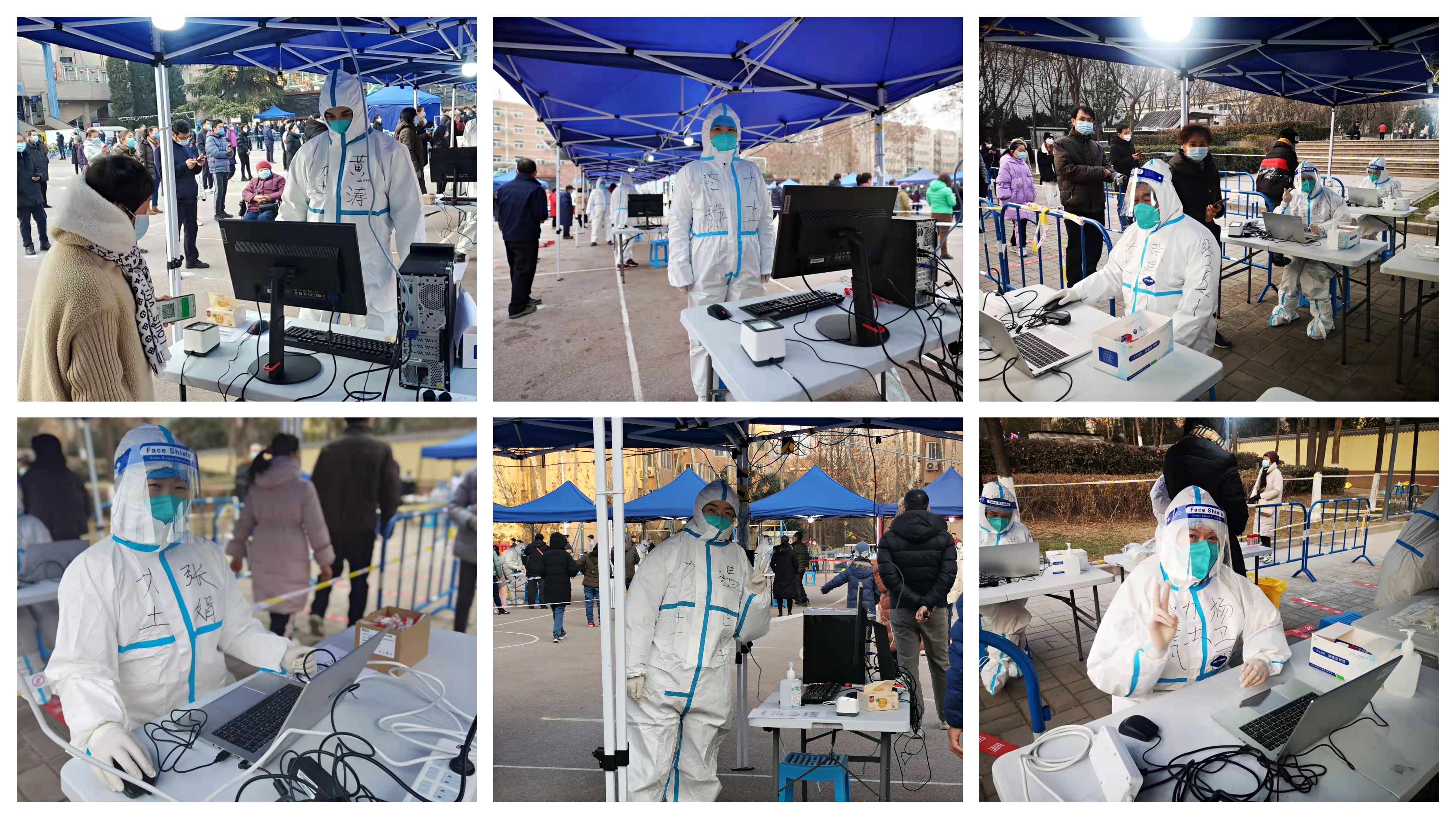 公司李静、张建平、温世峰、张娟、杨卫丽、黄涛等老师,参加全员核酸检测服务,变身“大白”,在严寒中坚持在防控一线进行核酸检测人员的身份核对工作;公司李栋、张刚、敖良波、黄涛、温世峰、曹普田等老师,分别在两个校区加入校门口执勤岗位,天还未亮已到岗负责查验出入人员的相关信息。