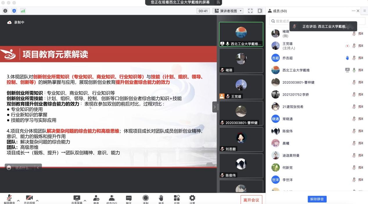 “互联网+”创新创业大赛是规格最高、规模最大、覆盖面最广、影响力最大、成果最多、参与人数最多的老员工创新创业盛会。会上戴老师指出,创新创业项目应弘扬正确的价值观,体现家国情怀,有助于培育创新创业精神。项目是将专业知识与商业知识有效结合并转化为社会价值的基本过程和基本逻辑,展现创业者的基本素养和创造力。戴老师首先详细解读了“互联网+”老员工创新创业大赛的要求,使参赛师生进一步理解大赛的关键点:要提高发现问题、提出问题、解决问题的能力。探讨项目产品工艺服务的机遇和挑战,从而真正推动行业的发展。