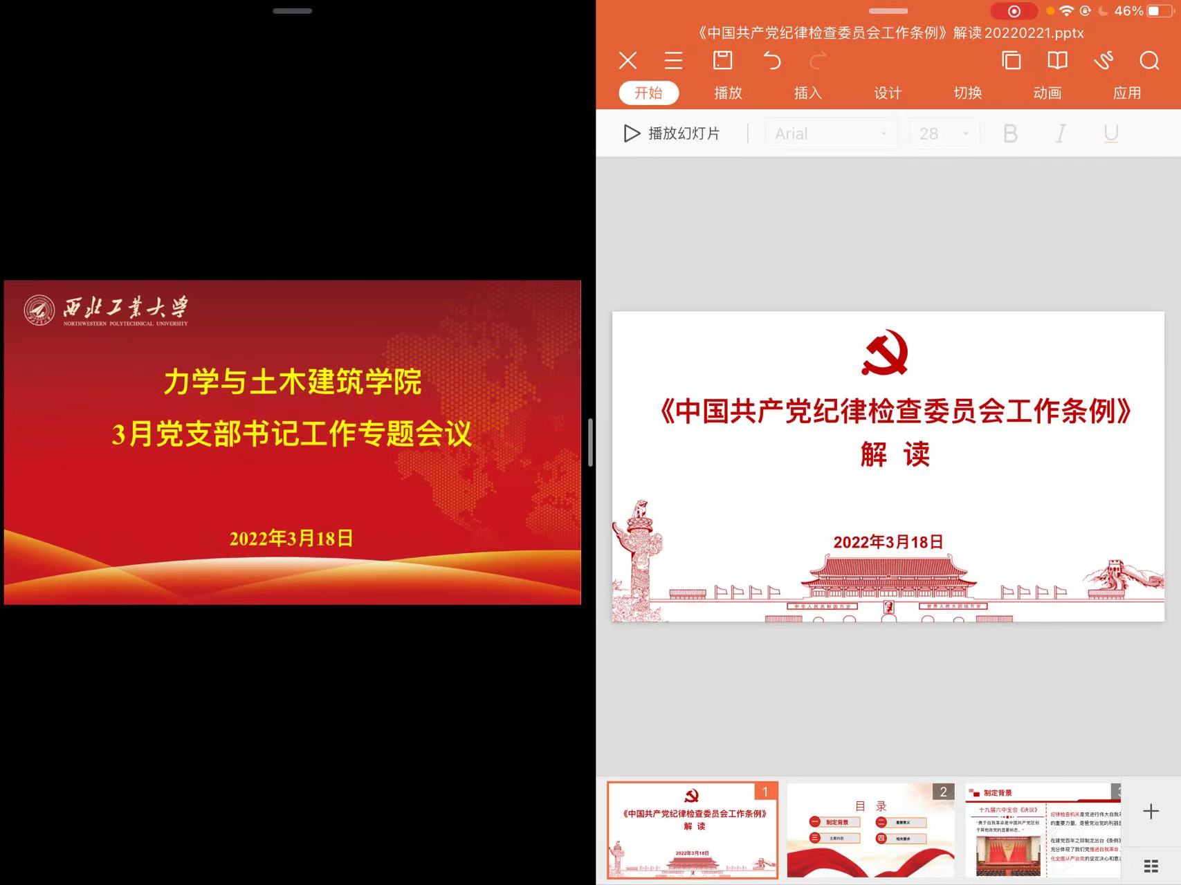 组织员徐雨萌首先带领与会人员学习了《中国共产党纪律检查委员会工作条例》,从《条例》制定背景、重要意义、主要内容、相关要求四个方面进行了详细讲解,巨维博同志表示《条例》是首部全面规范纪委工作的基础性党内法规,充分体现了我们党推进自我革命、深化全面从严治党的坚定决心和意志,各支部要认真抓好《条例》的学习宣传和贯彻落实,增强“四个意识”、坚定“四个自信”、做到“两个维护”,严格贯彻落实全面从严治党向纵深发展。
