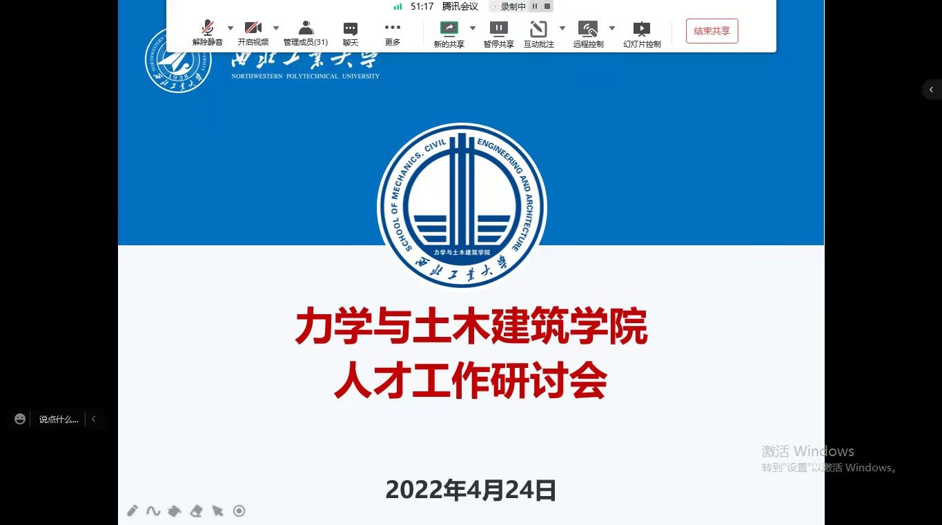为进一步深入学习领会中央人才工作会议精神,全面贯彻落实公司人才工作会议相关要求与工作部署,了解公司教师关于人才培养的意见和建议,研究谋划公司人才工作,4月24日,力学与土木建筑公司通过腾讯会议召开“一流本科、研究生人才培养”和“健全资源配置机制”专题研讨座谈会。公司党委书记巨维博、副经理张凯、副经理李磊及二十余位教师代表参加了会议。会议由巨维博主持。
