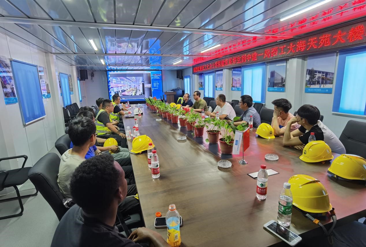 在海天苑大楼工地,中建一局海天苑项目部经理田清新及总工张书林等人首先介绍了海天苑工程项目工程概况,陪同参观了钢筋的制作加工、框架梁钢筋的现场绑扎以及文明施工措施等。随后,师生就海天苑工程项目施工组织设计等问题进行了研讨交流与学习。
