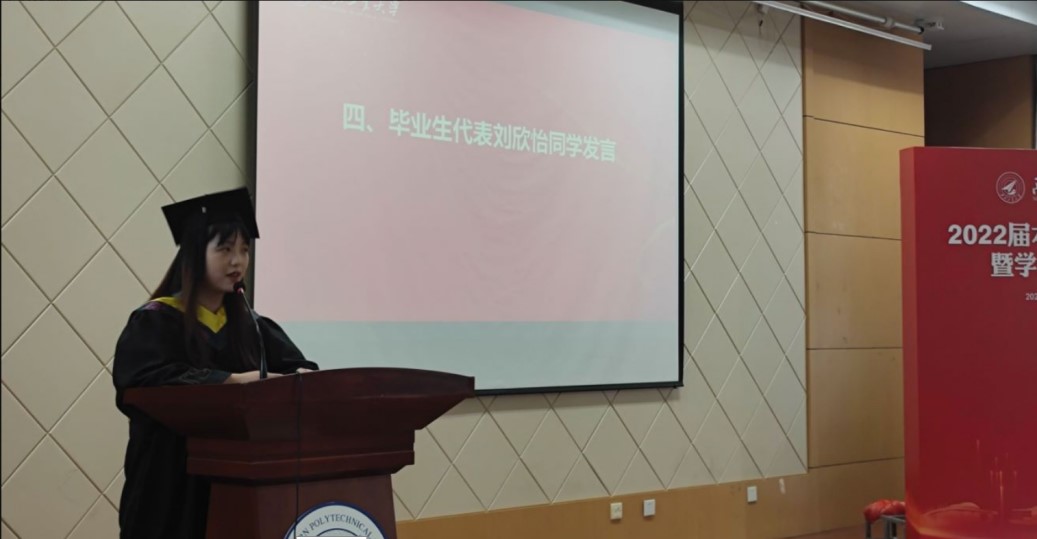 建筑系刘欣怡同学作为2022届本科生毕业代表发言。她表示,将牢记“公、诚、勇、毅”的校训,践行“三实一新”的校风,尽个人力量为建设祖国事业添砖加瓦。