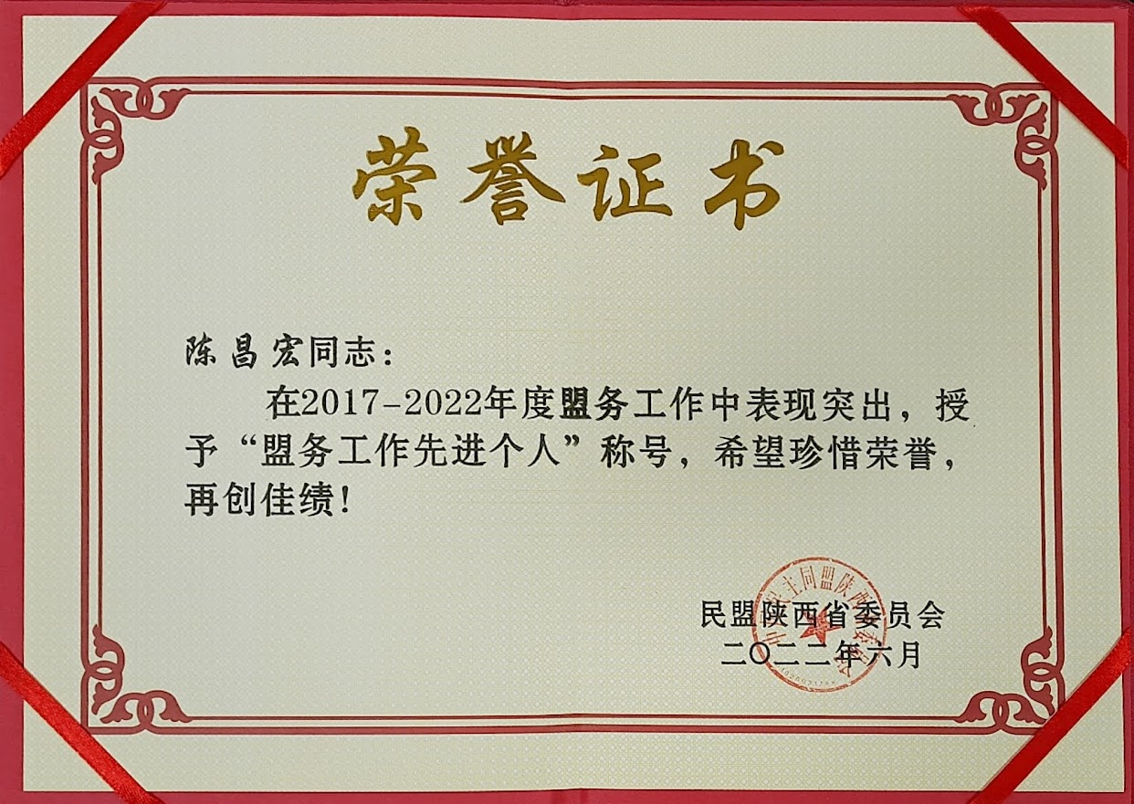6月23日,民盟陕西省十二届七次全委会在西安召开,会议对民盟陕西省委2017-2022年度盟务工作先进集体和先进个人进行了表彰。力学与土木建筑公司土木工程系副教授陈昌宏获2017-2022年度盟务工作先进个人。