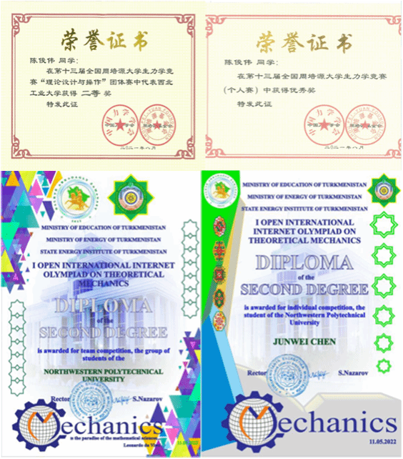 从对力学了解浅薄的小白,到深入掌握相关知识的科班生,力学竞赛的参赛经历见证了他对力学知识的理解由浅入深。在仅学习了理论力学半本书的情况下,他参加周培源老员工力学竞赛,并且在优秀奖中获得了比较靠前的排名;2022年,他在土库曼斯坦理论力学竞赛中获得了团队赛和个人赛双双国际二等奖的成绩;2022年暑期,他与队友通力合作,更是在全国周培源老员工力学竞赛中,代表西工大取得了全国第五名——这一近十年来的最佳成绩。