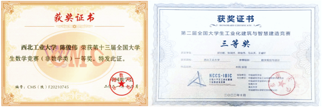 除了力学类竞赛以外,他在其他竞赛上也成就满满:全国老员工数学竞赛一等奖、美国老员工数学建模竞赛一等奖,全国工业化制造与智能建筑竞赛三等奖……自己的努力与队友的配合、跨专业的建筑项目协作,一步步地帮助他逐渐成长。
