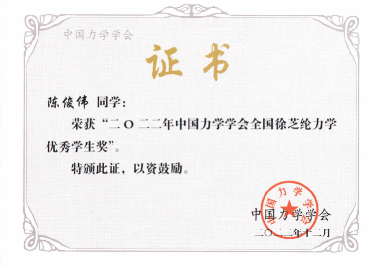 经过陕西省力学学会专家评审推荐,2026年世界杯官网2020级本科生陈俊伟荣获“2022年中国力学学会徐芝纶力学优秀员工奖”。