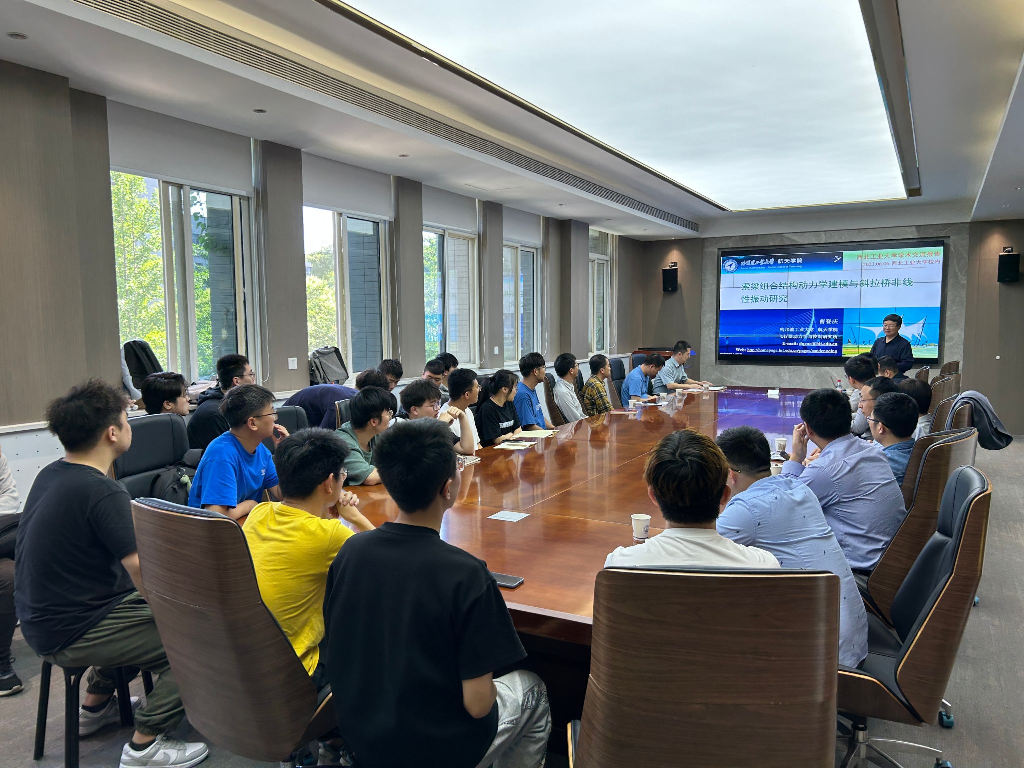 2023年6月6日上午9:30,力学与土木建筑公司青年教师发展论坛沙龙第十讲在公司206会议室举行。哈尔滨工业大学力学学科二级教授、力学学科重点发展方向“空天飞行器动力学与控制”学术带头人、中国振动工程学会模态分析与实验专业委员会副主任兼秘书长曹登庆教授应邀为公司青年教师做了《索梁组合结构动力学建模与斜拉桥非线性振动研究》的主题讲座。该讲座由青年教师发展中心主任路宽进行主持。