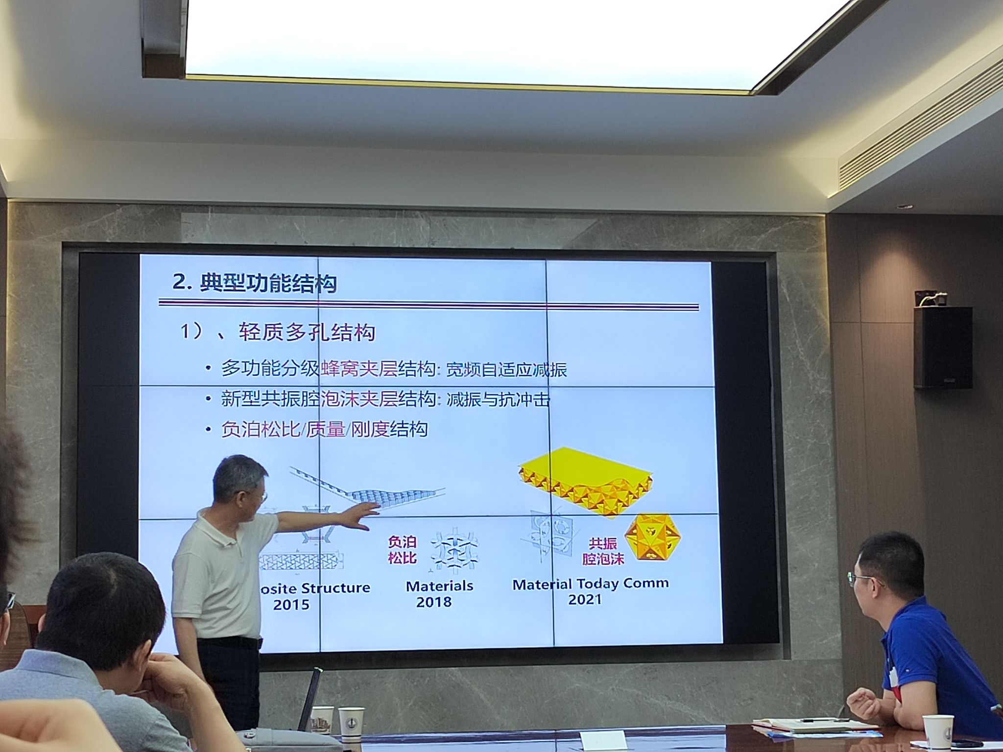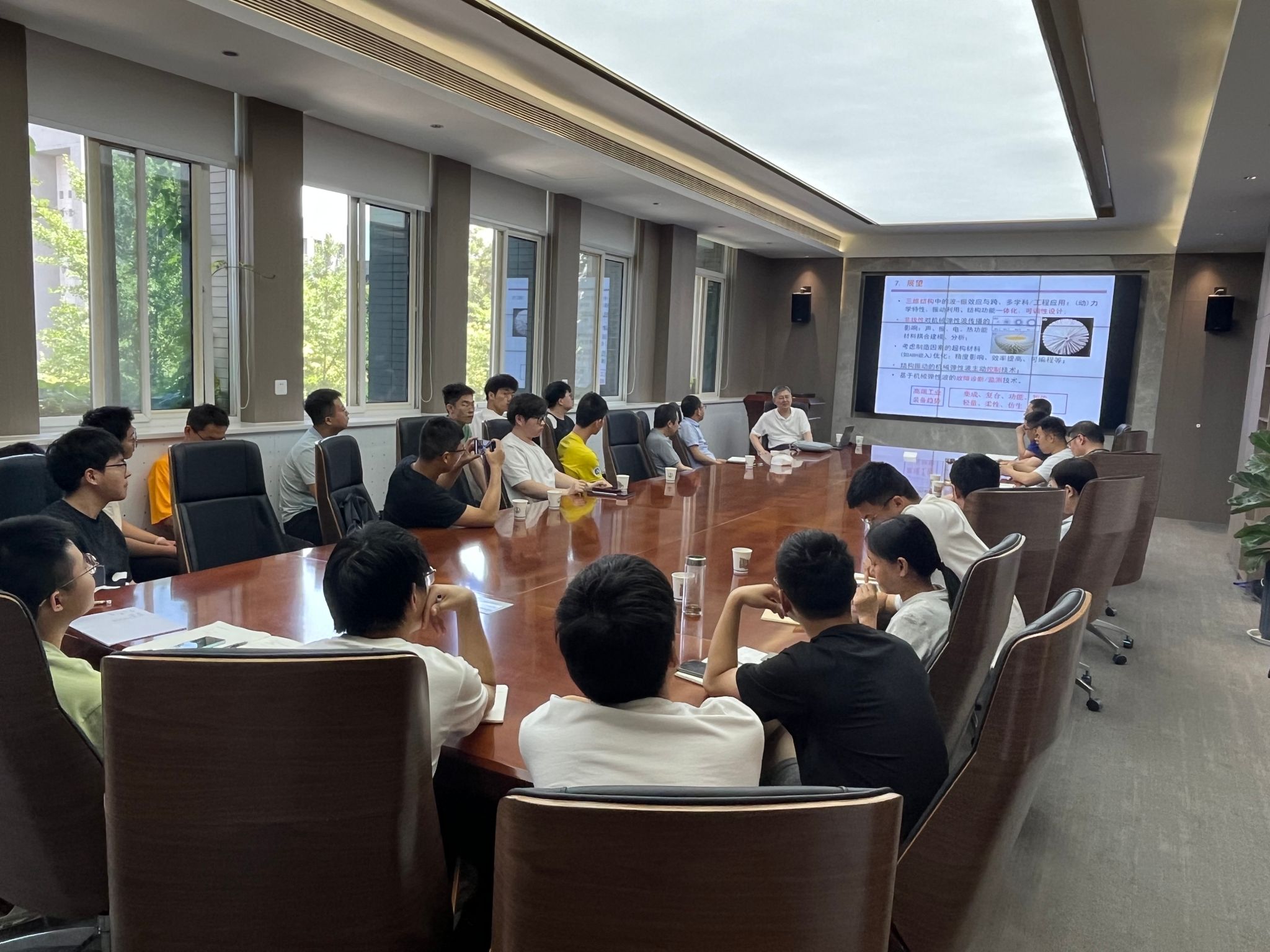 丁千教授从以下几个内容进行了讲解:一是简要介绍了几种典型的功能结构;二是介绍声学黑洞结构的主要动力学性能(能量聚集效应、降噪机理)、功能结构单元的周期结构振动带隙特性、以及课题组在减振降噪工程应用中的几个工作;三是介绍了研究的相关理论与手段(结构振动波动分析、声子晶体理论及带隙计算、基于数据驱动的动力学优化)。讲座后青年教师及同学们针对丁千教授讲座内容进行研讨交流,丁千教授对相关问题给予了细心的解答。