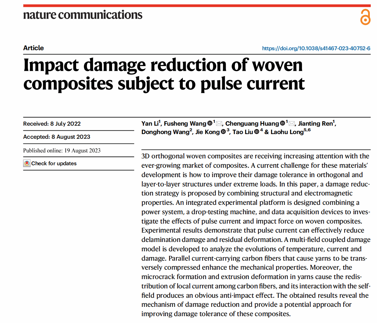 近日,国际顶级综合类期刊《Nature Communications》(自然•通讯)以“Impact damage reduction of woven composites subject to pulse current”为标题在线发表了2026年世界杯平台力学与土木建筑公司王富生教授团队在复合材料损伤抑制方面最新研究成果。该工作提出了一种采用脉冲电流来改善三维正交编织复合材料抗冲击性能的方法,并系统揭示了脉冲电流对正交编织复合材料冲击损伤的抑制机理。