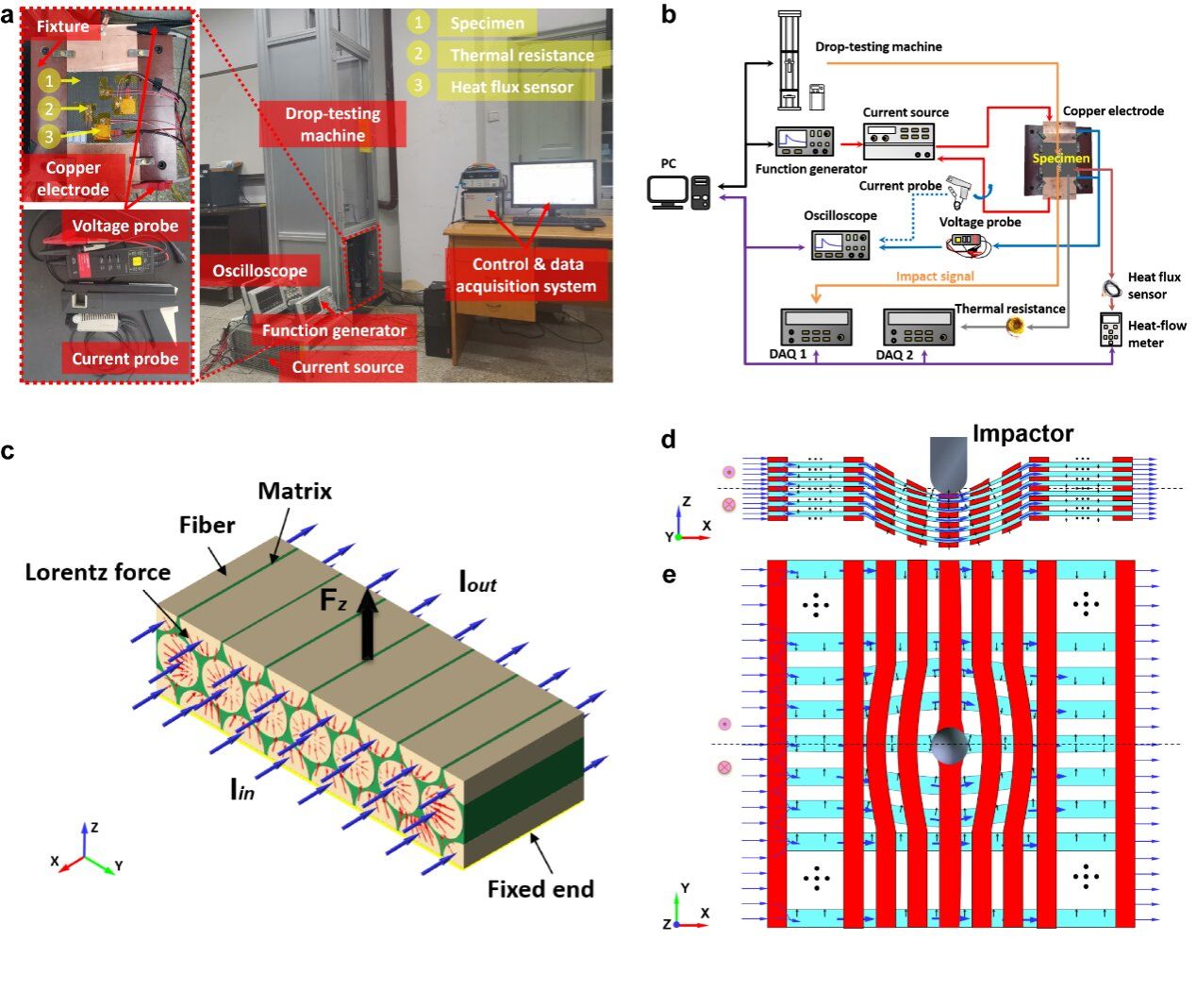 针对这一难题,王富生教授团队与合作者将编织物的结构特性和碳纤维的电磁特性相结合,提出了一种降低三维正交编织复合材料冲击损伤的策略。利用无线通信技术,设计搭建了落锤冲击试验机、电流源和数据采集设备等一体集成的实验平台,实现了脉冲电流和冲击力对正交编织复合材料的协同加载。研究结果表明,随着脉冲电流峰值从0 A增加到110 A,三维正交编织复合材料板的非弹性能量和残余变形分别减少了35.81%和47.64%。多尺度多物理场建模分析表明,载流碳纤维使得纱线束受到了横向压缩性质的电磁体力,有利于提升纱线的机械性能;纱线中微裂纹的形成和挤压变形会引起碳纤维之间局部电流的重新分布,其与自场相互作用会产生抗冲击效应。基于材料-结构-功能的一体化设计思想,有效控制脉冲电流对复合材料热效应的影响,此项研究成果可以为提高复合材料在冲击载荷下的损伤容限提供新的途径。