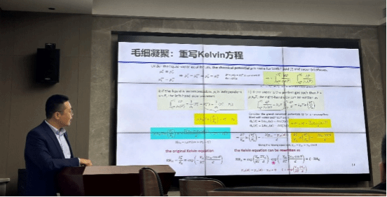 王奉超教授主要介绍了近年来在固液界面润湿及限域传质微尺度力学领域的相关工作。在固液界面纳米力学方面,王奉超教授首先从毛细凝聚现象出发,介绍了固液界面力学作用在纳米限域毛细凝聚中的重要影响,基于此提出了修正后的Kelvin模型,该研究为理解纳米限域毛细凝聚提供了关键的理论依据。随后,王奉超教授介绍了其团队关于固液界面毛细力的研究工作,从毛细力平衡的角度给出了Young方程的合理解释,阐明了液滴接触线处受力平衡的微观力学机理。在限域传质微尺度力学领域方面,王奉超教授针对纳米通道气体输运问题提出了普适的Knudsen公式,经分子动力学模拟验证,证明其广泛适用于各种不同壁面粗糙度、不同横截面形状和尺寸的通道,合理描述了纳米通道气体运输。此外,王奉超教授还介绍了页岩纳米孔道气体输运的相关研究。页岩气作为储量大、分布广的非常规油气资源,具有广阔的开发前景,王奉超教授团队从微观界面物理力学作用及分子模拟入手,研究有机质成烃演化与页岩油启动运移过程,为建立页岩油可动用性评价和动用技术开发提供分子模型和微观力学理论基础。讲座后老师同学们针对讲座内容及科研相关问题进行了充分的讨论,王奉超教授也对老师同学们提出的问题给予了详细的解答。