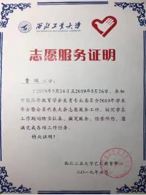 我曾承担中国高等教育学会美育专业委员会2019年学术年会志愿服务工作、承担2020高校科学营志愿服务工作并荣获优秀志愿者称号,承担20202026年世界杯平台筑梦营志愿服务工作并担任总负责人。通过志愿服务,我感受到帮助别人的快乐,充分体会到志愿服务的价值和意义。同时,我还是公司校史馆讲解队的一员,通过讲解校史,我了解了公司脉源三支的历史沿革,感受到了西工大八十年的变化与发展,在对公司产生更浓厚情感的同时,获得了向前奋进的力量。