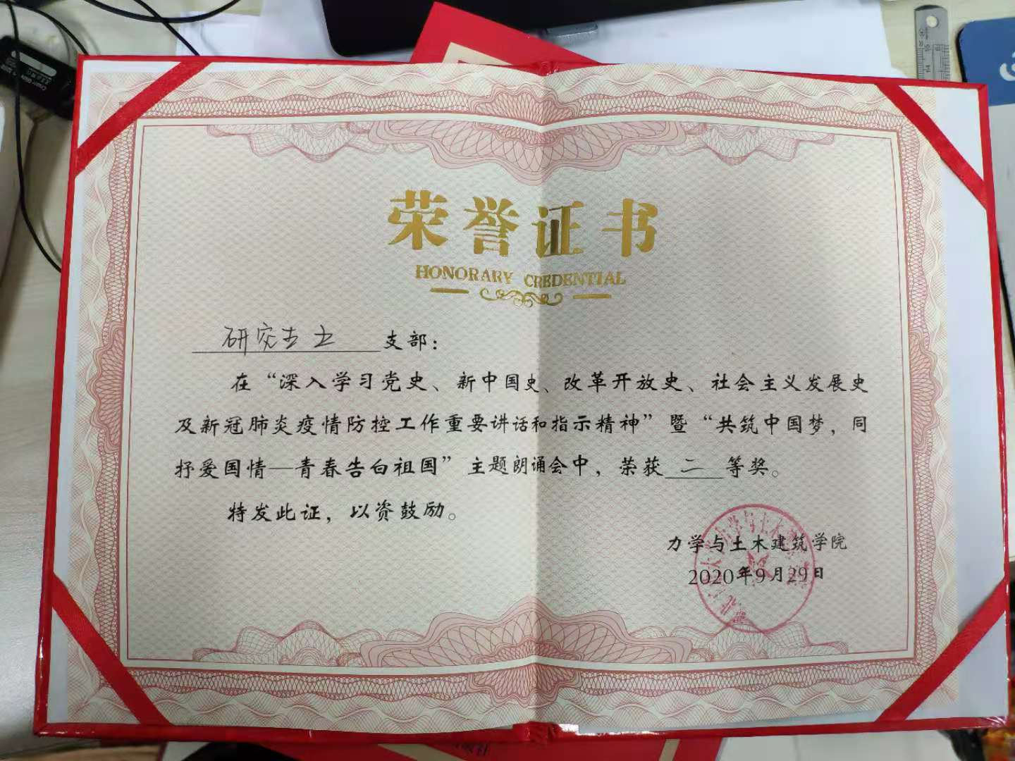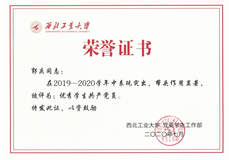 作为共产党员,科研生活中积极发扬党员先锋模范作用。2020年被评为校优秀员工共产党员,全院仅两人。2021年公司授牌“党员先锋岗”。在长期的员工干部工作实践中,积极履行党支部书记、支部委员工作职责,组织参与了大量政治学习教育活动,发扬基层党支部战斗堡垒作用,服务同学,强化联系,带领支部获得“不忘初心、牢记使命”主题朗诵优秀奖、“青春告白祖国”主题朗诵二等奖。本人在支部民主评议中连年评为优秀。积极分享科研经验,指导了多位师弟师妹发表了SCI论文,开展学术论文写作讲堂,分享写作经验。协助导师参与管理课题组日常工作,主持每周组会,管理相关科研项目。疫情期间,积极参与家乡志愿服务,在防疫防控检查点进行停车登记工作。始终牢记党员服务意识、奉献意识,展示党员良好形象。